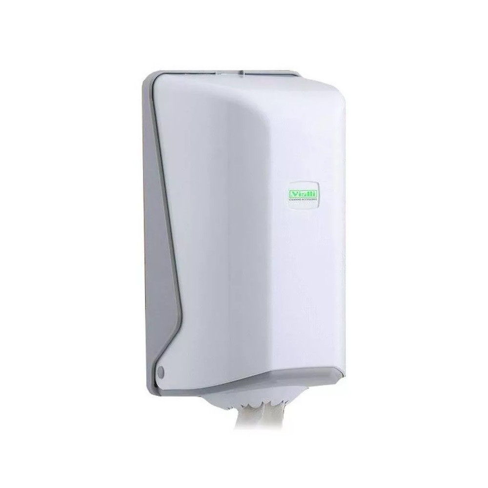 Vialli tekercses kéztörlő adagoló. 14 cm átmérőjű belsőmag adagolású papír kéztörlővel használható. Az adagoló nyílása tépőfogakkal van ellátva, így perforált és perforáció nélküli papírral is használható.