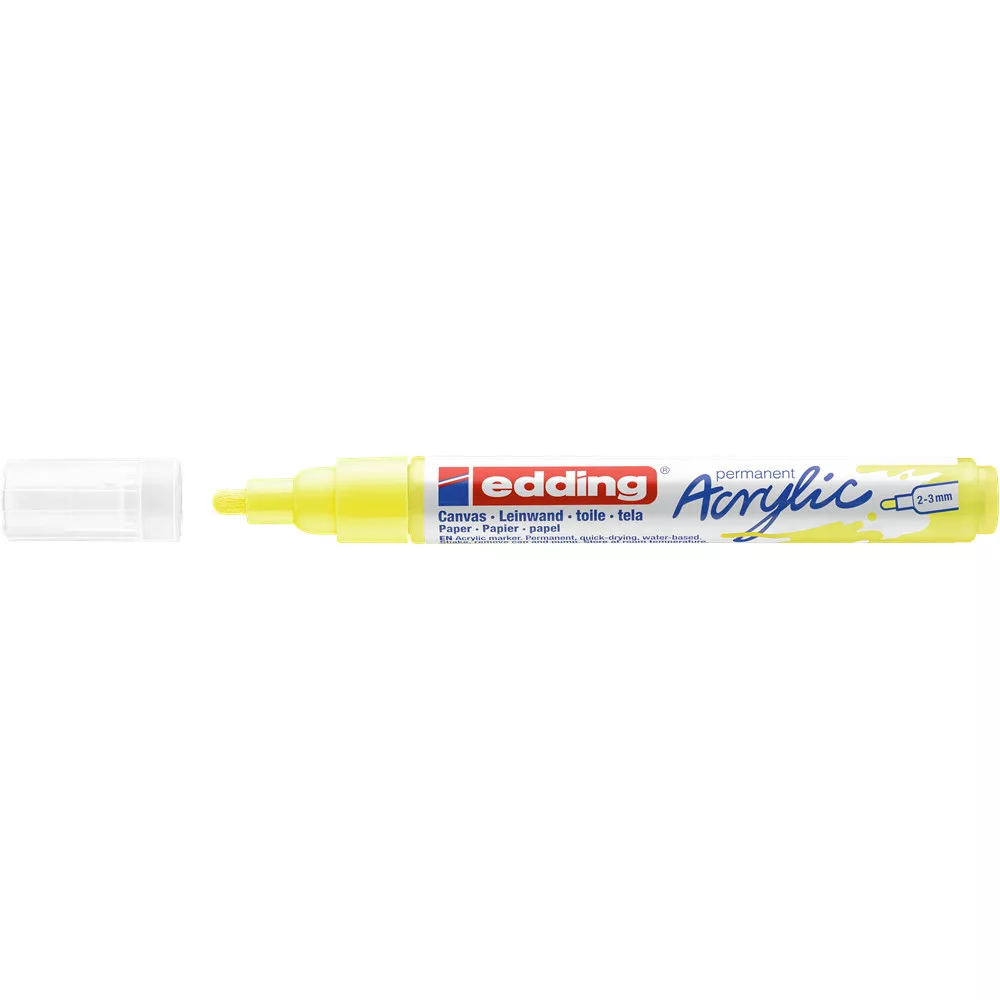Akril marker világos vagy sötét felületekre történő festéshez, ideális olyan anyagokhoz, mint a vászon vagy a festőpapír. - A kerekített csúcs vonalvastagsága 2-3 mm. - A kiváló minőségű, pigmentált, vízbázisú akrilfesték száradás után rendkívül tartós, átlátszatlan, fényálló és szagtalan. - A neon sárga szín áttetsző. Megfelelő pótcsúcsok (edding 5100 pótcsúcsok) elérhetők.- 26 féle színválasztékban elérhető- Keresse a további változatokat - edding 5000 és az edding 5300-at, valamint az edding 5400 3D hatású 2 végű akril markereket. Katalóguskód: 36464