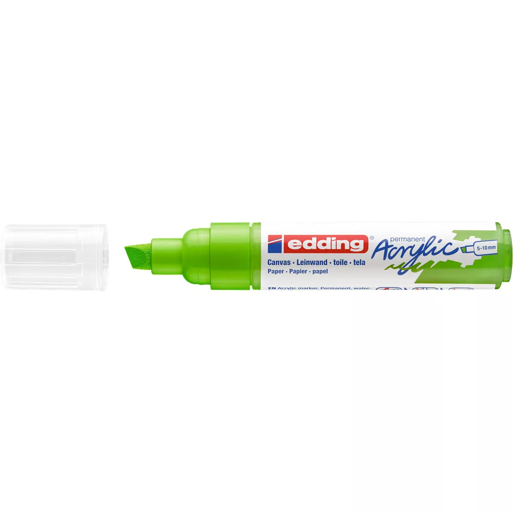 Akril marker világos vagy sötét felületekre történő festéshez, ideális olyan anyagokhoz, mint a vászon vagy a festőpapír. - A vágott írócsúcs vonalvastagsága 5-10 mm. - A kiváló minőségű, pigmentált, vízbázisú akrilfesték száradás után rendkívül tartós, átlátszatlan, fényálló és szagtalan. - A neon sárga szín áttetsző. Megfelelő pótcsúcsok (edding 5000 pótcsúcsok) elérhetők.- 26 féle színválasztékban elérhetők.- Keresse a további változatokat - edding 5100 és az edding 5300-at, valamint az edding 5400 3D hatású 2 végű akril markereket. Katalóguskód: 36510