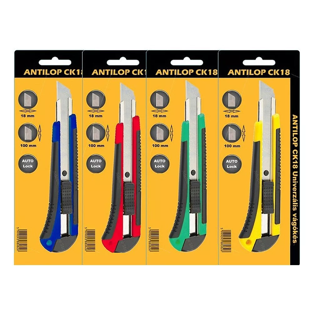 Barkácskés 18mm, gumírozott fogórész, fém vezetősínnel, Antilop vegyes színekben kiváló választás mindennapi használatra. Megbízható, tartós és praktikus megoldás!
