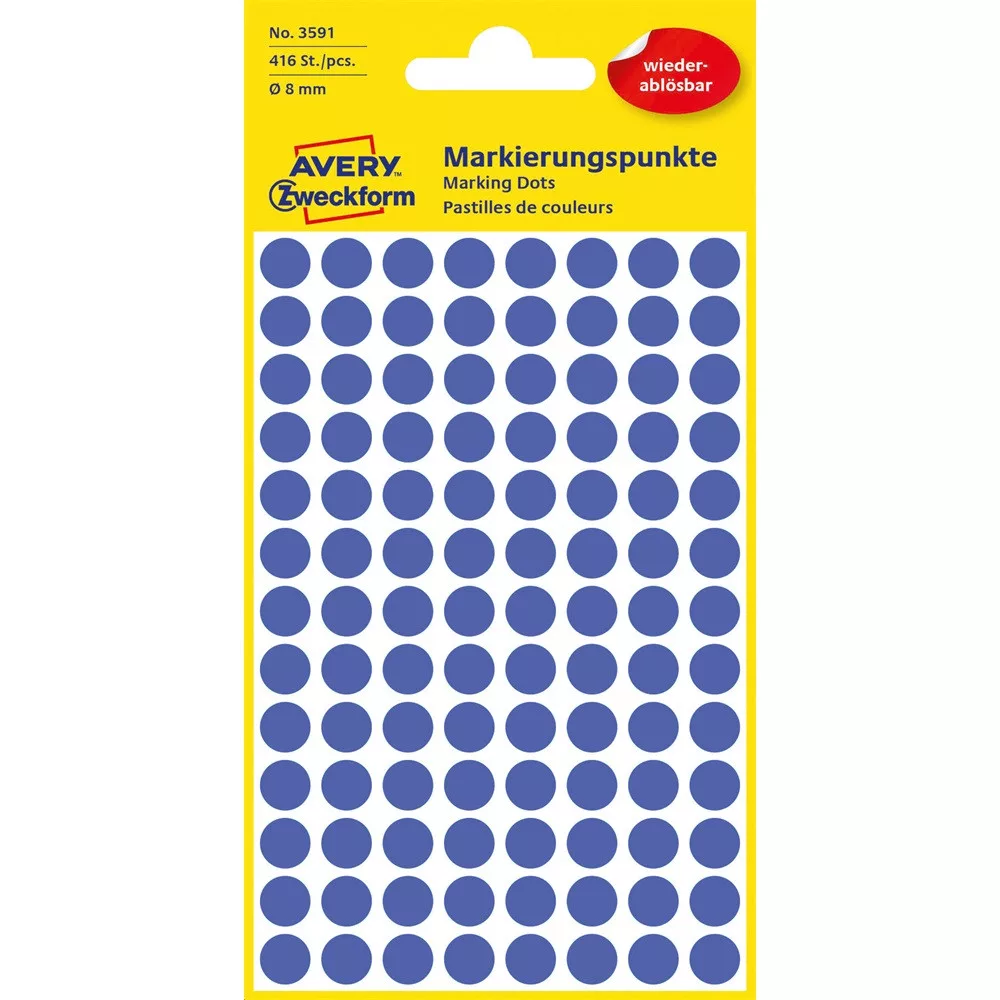 Címke mérete: 8 mm Csomag tartalma: 416 jelölőpont/csomag Öntapadó, visszaszedhető AVERY ZWECKFORM jelölőpont tökéletes jelöléshez, rendszerezéshez, tervezéshez és iratrendezéshez. Katalóguskód: 25394