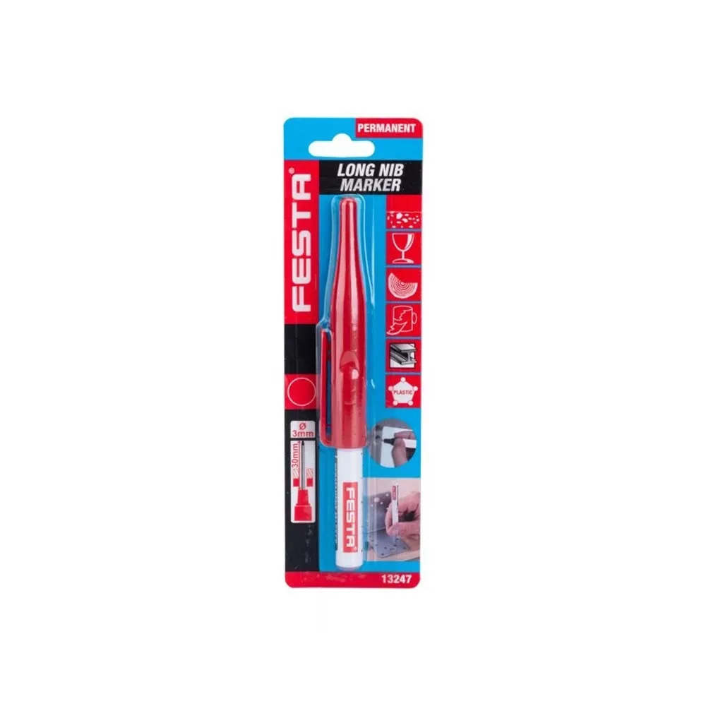 Furatközéppont jelölő filc - piros, tartós jelölés, a csúcs átmérője 3 mm, így lehetővé teszi a kis átmérők jelölését akár 30 mm vastag anyagokon keresztül.