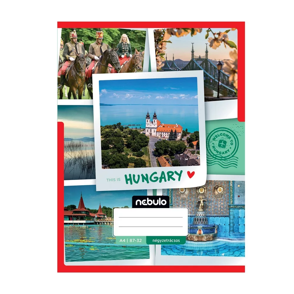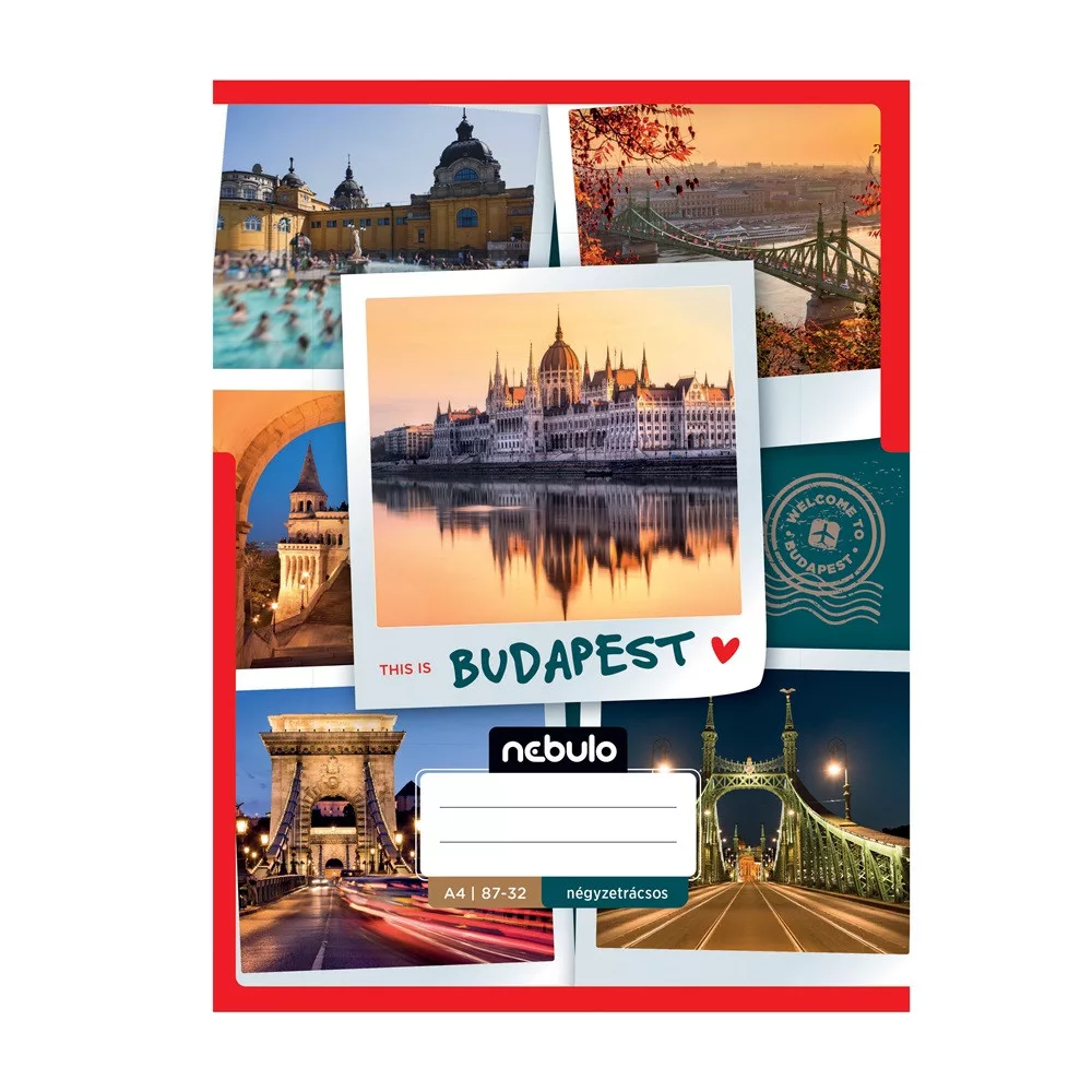 A/4-es tűzött iskolai négyzetrácsos füzet, 32 lapos (87-32). 12 db füzet (6 különböző országos/városos minta, azaz 2db/minta) van egy csomagban. 70 g-os füzetlapok és 200 g-os műnyomó borító fényes fóliával.