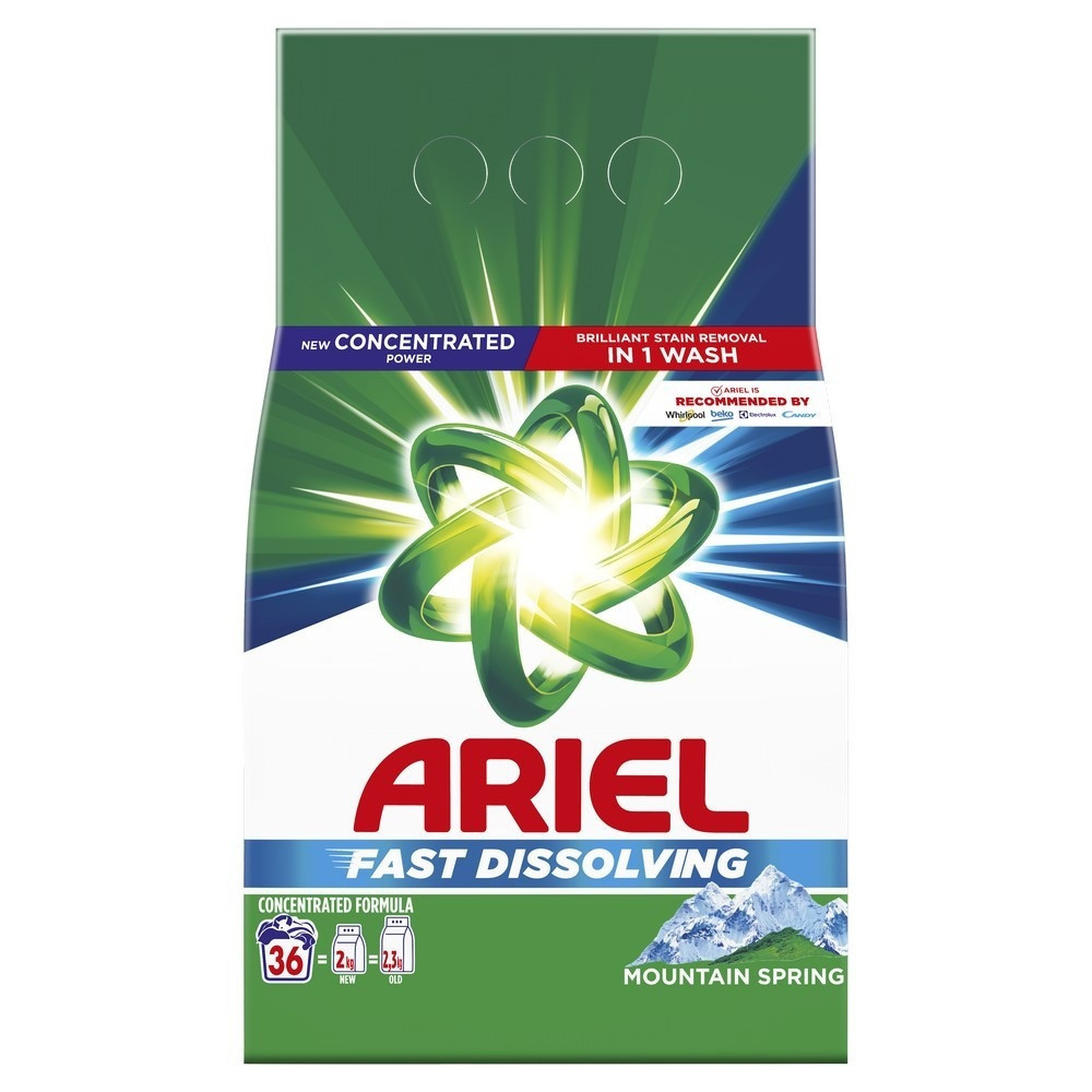 Mosópor 1,98 kg (36 mosás) fehér ruhákhoz Ariel Mountain Spring kiváló választás mindennapi használatra. Megbízható, tartós és praktikus megoldás!