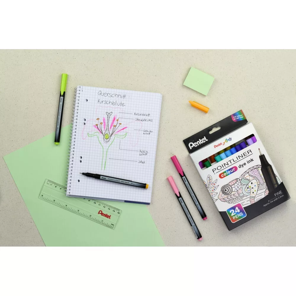 A Pentel színes tűfilc egy vékony hegyű, műanyag írócsúccsal és vízbázisú (dye) tintával ellátott tűfilc, amely a Pentelre jellemző kiemelkedő minőséget képviseli. Kifejezetten ajánlott finom íráshoz, javításhoz, rajzoláshoz és vázlatkészítéshez, hiszen a 0,4 mm-es hegy pontos és precíz vonalvezetést tesz lehetővé. Az élénk, gazdag színeknek köszönhetően a munka nemcsak pontos, hanem látványos is lehet. A tűfilc 24 különböző színben érhető el, így minden feladathoz vagy kreatív projekthez megtalálható a megfelelő árnyalat. Használat után a tinta kiszáradásának elkerülése érdekében mindig gondosan zárd vissza a kupakot. A Pentel tűfilc megbízható társ a mindennapokban, legyen szó tanulásról, munkáról vagy szabadidős alkotásról.1 darab zöld rózsaszín