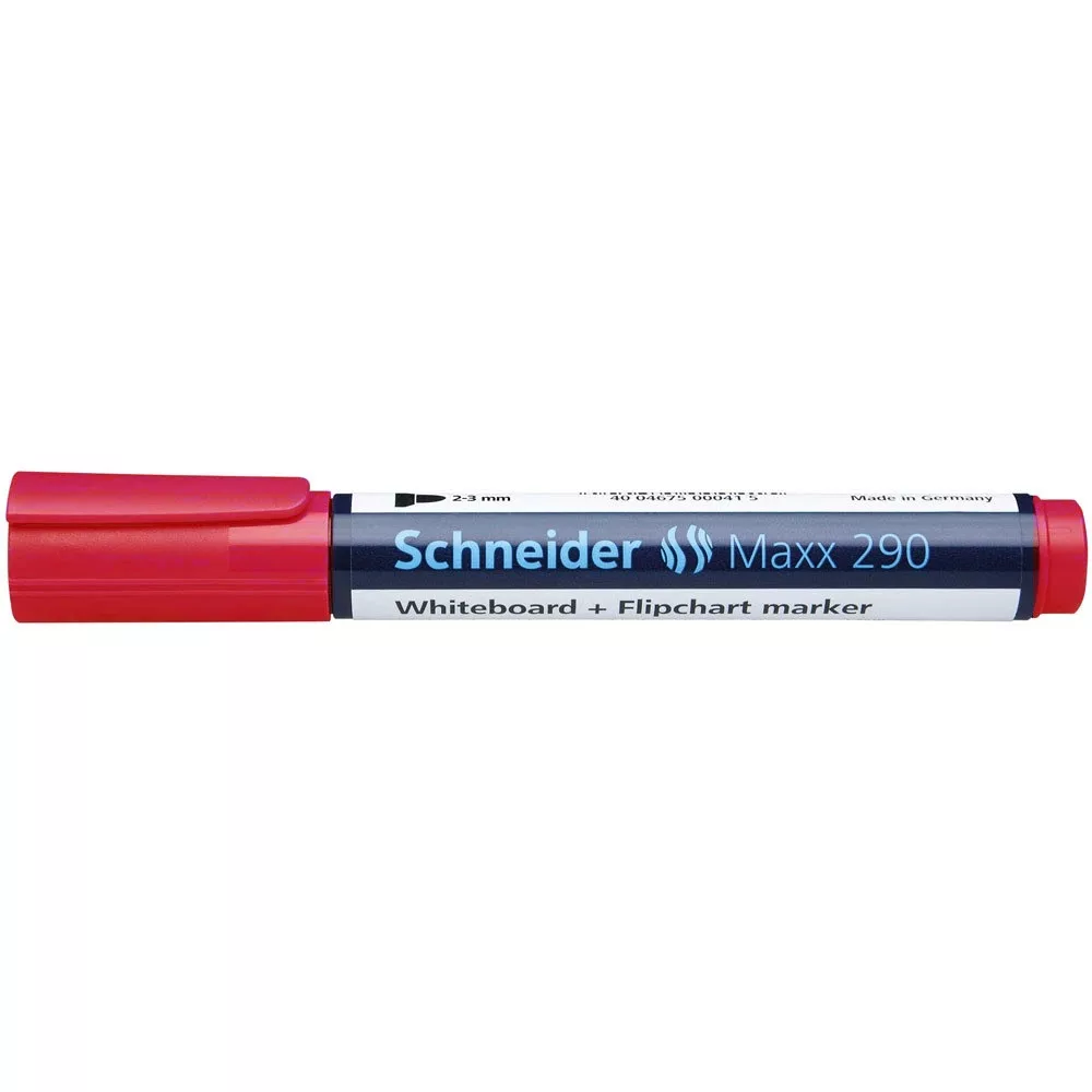 Hosszan tartó, nem fakuló tinta! Tábla- és flipchart marker 2-3mm, kerek végű Schneider Maxx 290 piros tökéletes választás kiemeléshez és kreatív munkákhoz.