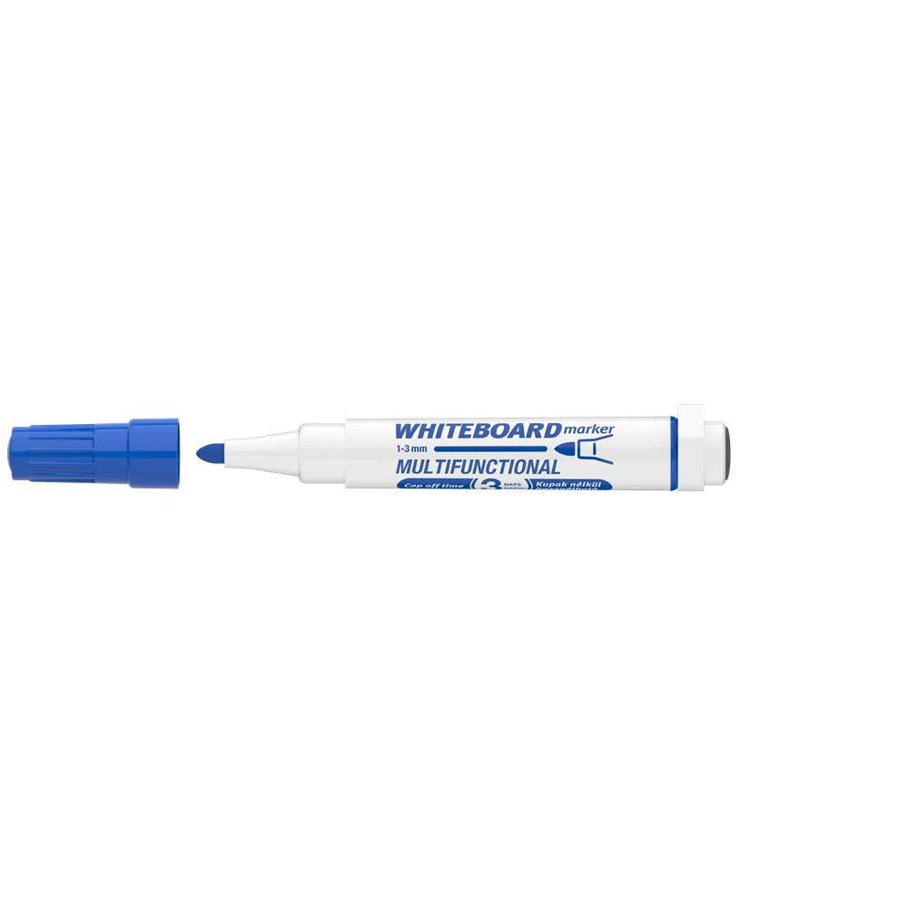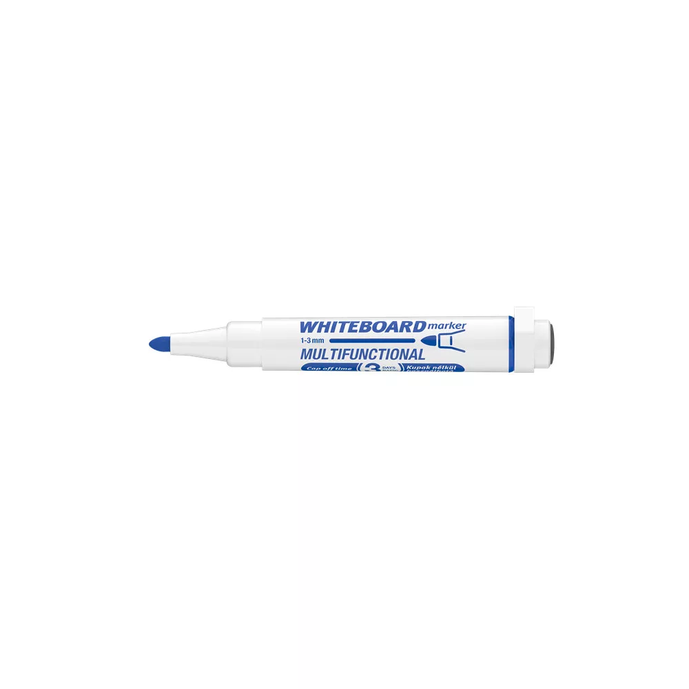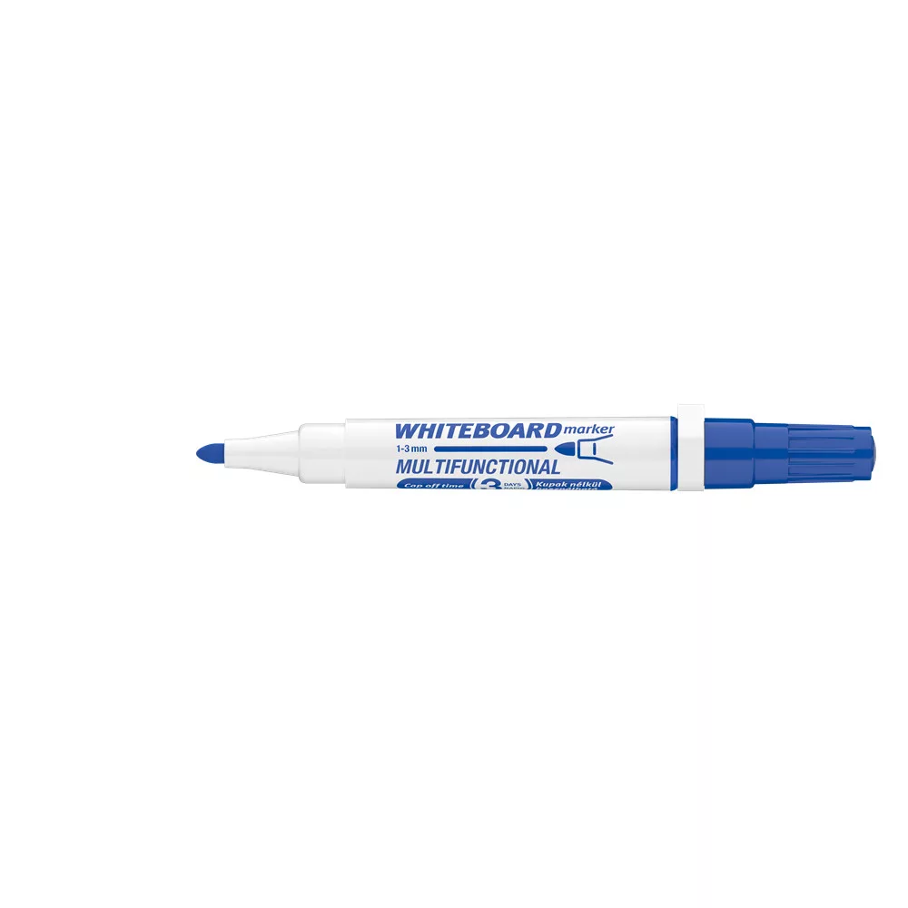 Multifunkciós táblamarker: - mágneses fehértáblára való írásra, rajzolásra. - speciális festékanyagának köszönhetően, néhány napig, kupak nélkül sem szárad be. -a kupakban elhelyezett mágnes révén, acél táblafelületeken rögzíthető. - az írás szárazon letörölhető, melyet a kupak végén található táblatörlő korong is segít. Kerekített csúccsal. Vonalvastagság: 3 mm. Katalóguskód: 19364