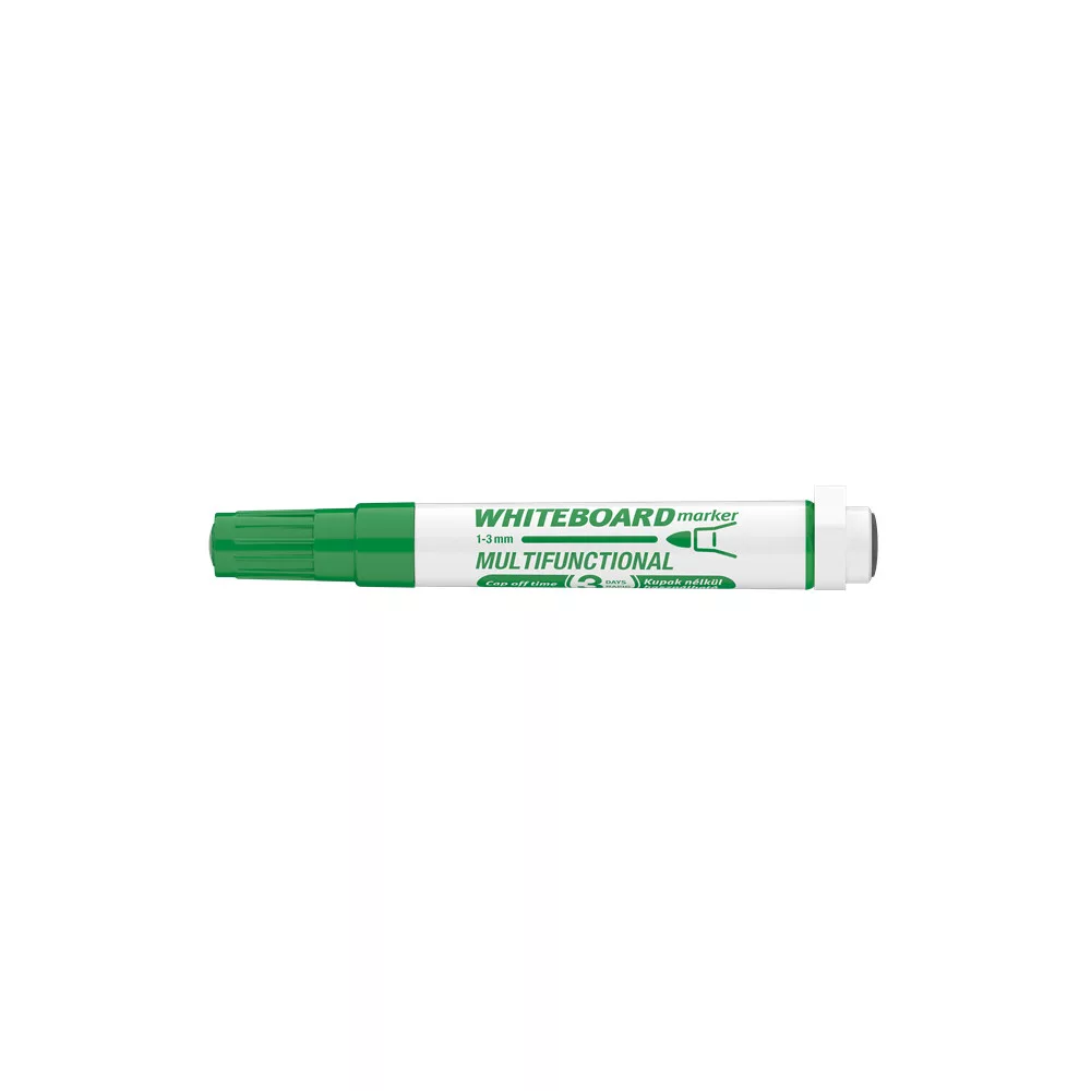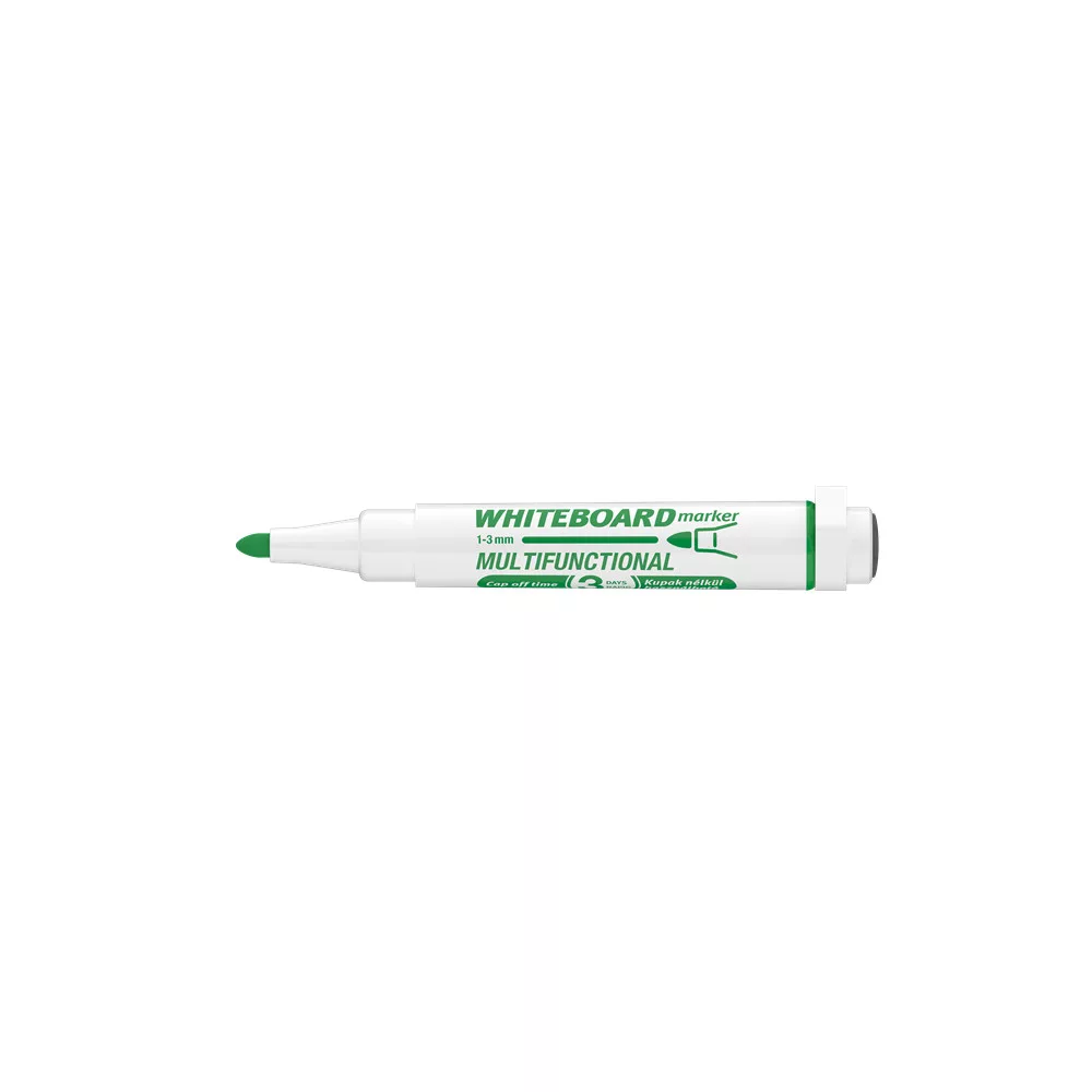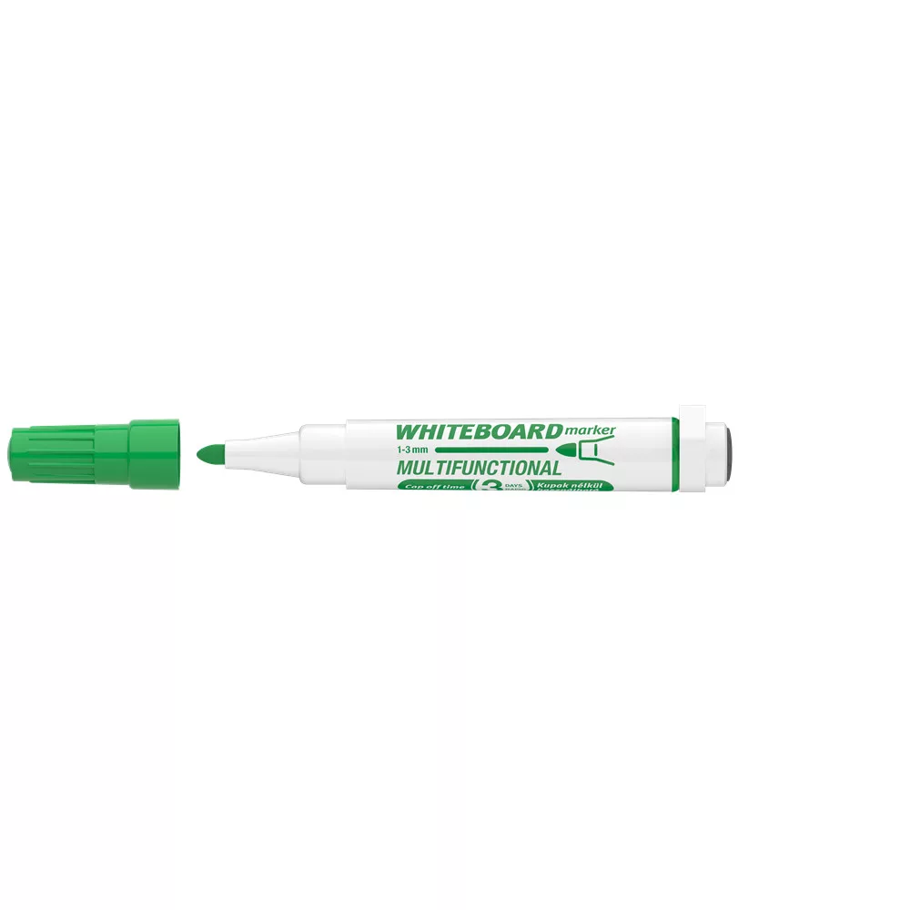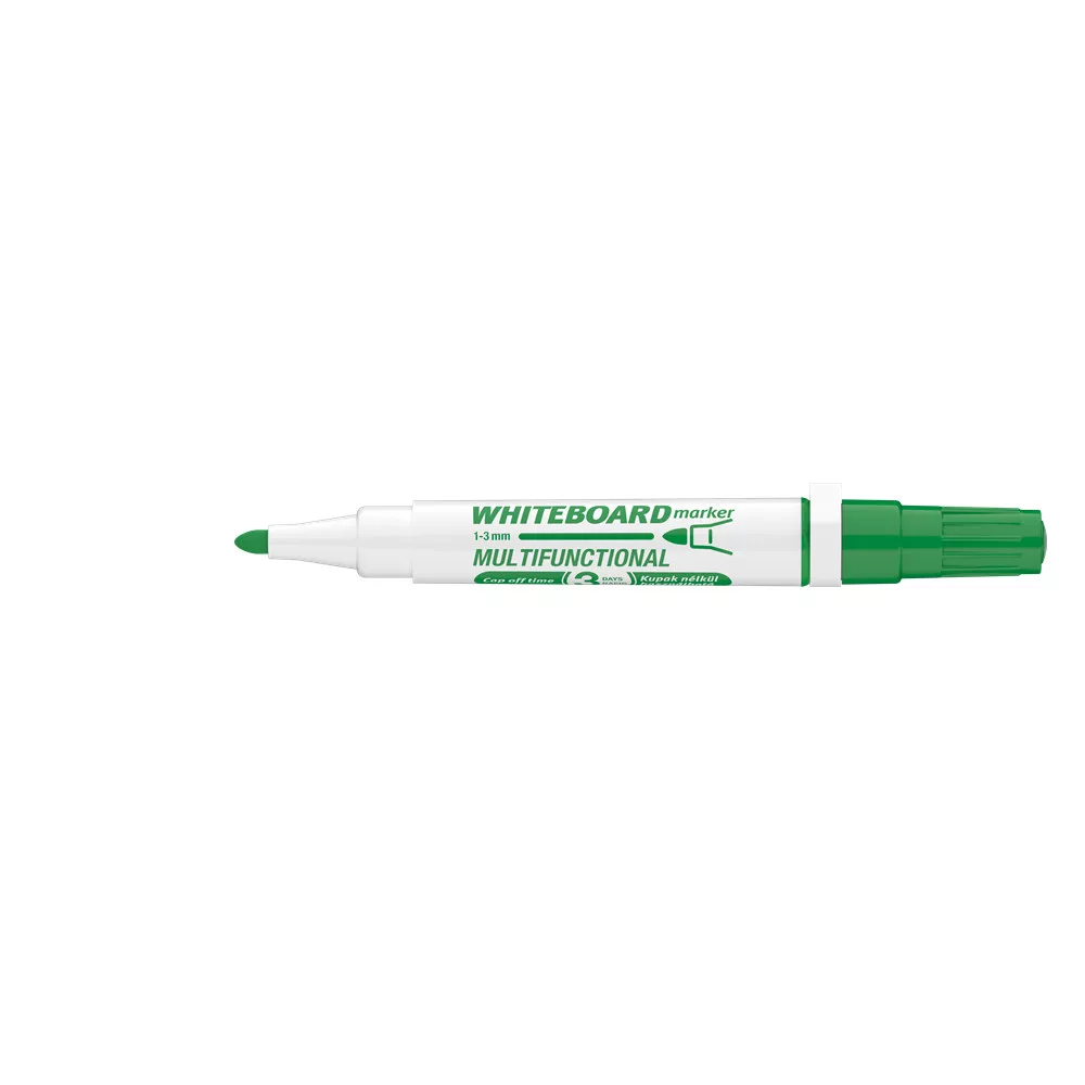 Multifunkciós táblamarker: - mágneses fehértáblára való írásra, rajzolásra. - speciális festékanyagának köszönhetően, néhány napig, kupak nélkül sem szárad be. -a kupakban elhelyezett mágnes révén, acél táblafelületeken rögzíthető. - az írás szárazon letörölhető, melyet a kupak végén található táblatörlő korong is segít. Kerekített csúccsal. Vonalvastagság: 3 mm. Katalóguskód: 19366