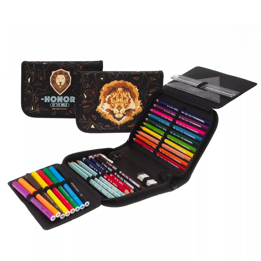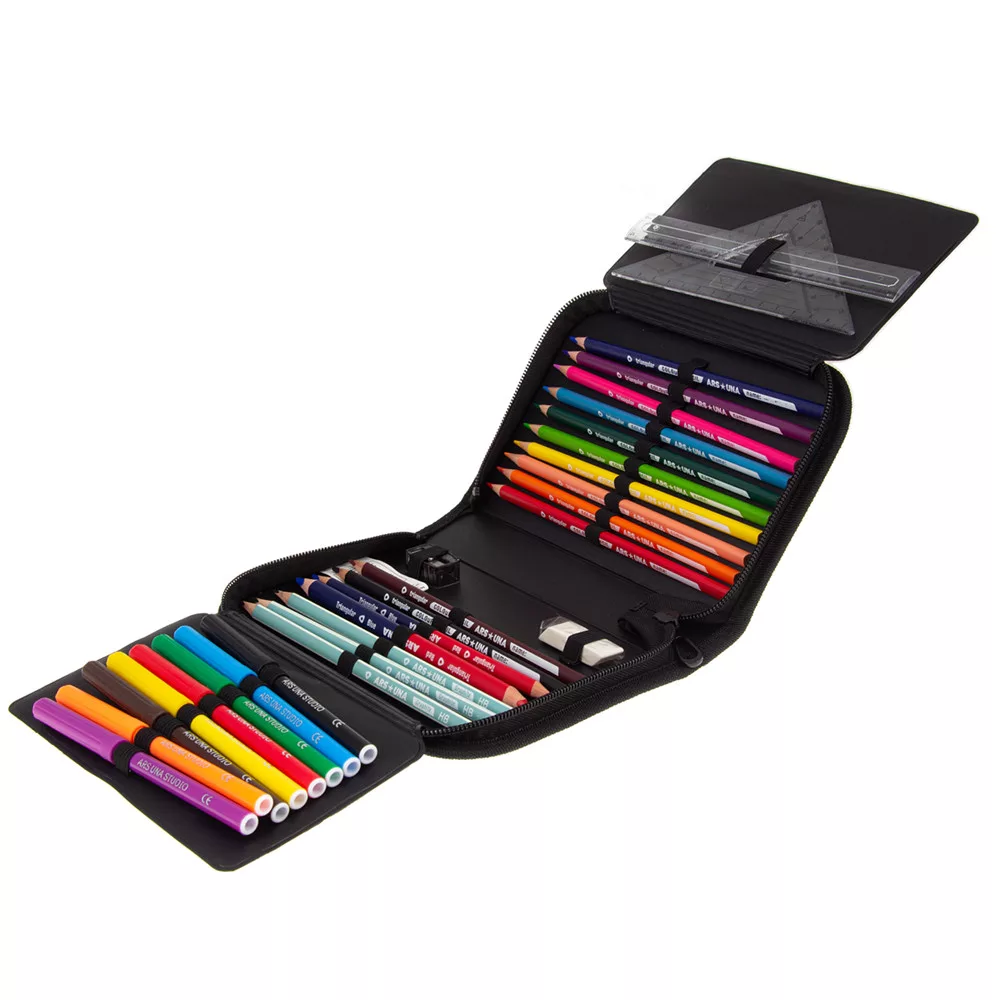 Írószerekkel töltött cipzáros tolltartó két kihajtható füllel, gumis kialakítással az írószerek tárolásához. Tartalma: 12 db színes ceruza, 3 db HB grafit ceruza, 1 vékony és 1 vastag postairón, 8 db színes filctoll, 1 db radír, 1 db hegyező, 1 db 17 cm-es egyenes vonalzó, 1 db háromszög vonalzó, órarend A és B hétre.