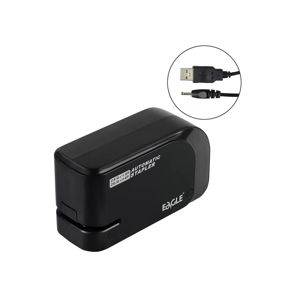 Tűzőgép elektromos 20lap, 24/6 és 26/6 elemmel és USB kábelel is működtethető fekete EAGLE EG-1610